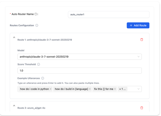 • Score Threshold - The minimum similarity score (0.0-1.0) required to trigger this route